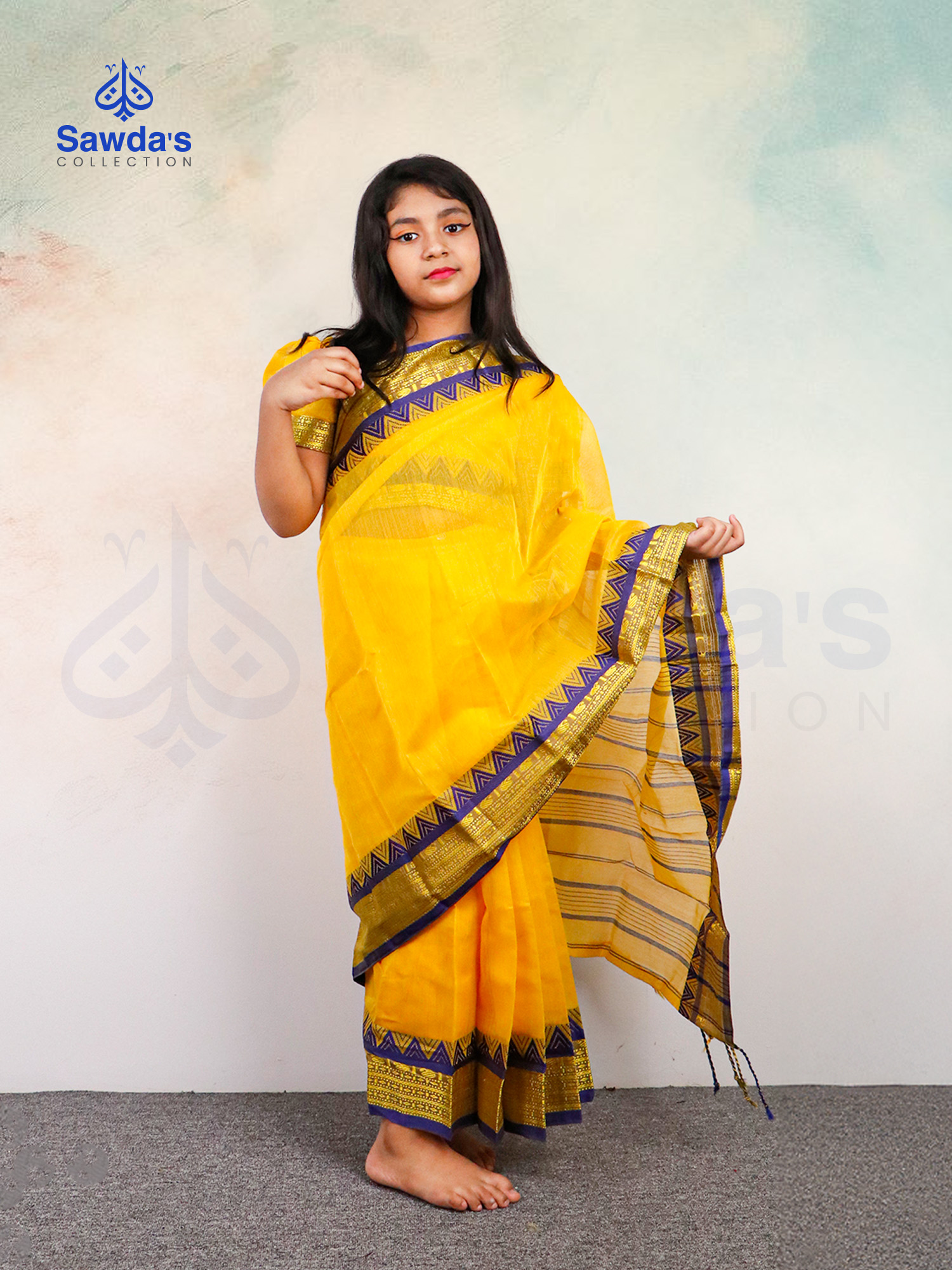 আর সাথে আছে সুন্দর ডিজাইনের ব্লাউজ। খুলে যাওয়ার কোন ভয় নেই আর শাড়ির ইনার অনেক উন্নত মানের ভয়েল ফেব্রিক এর তাই বাচ্চাদের জন্যে হবে খুব আরামদায়ক।